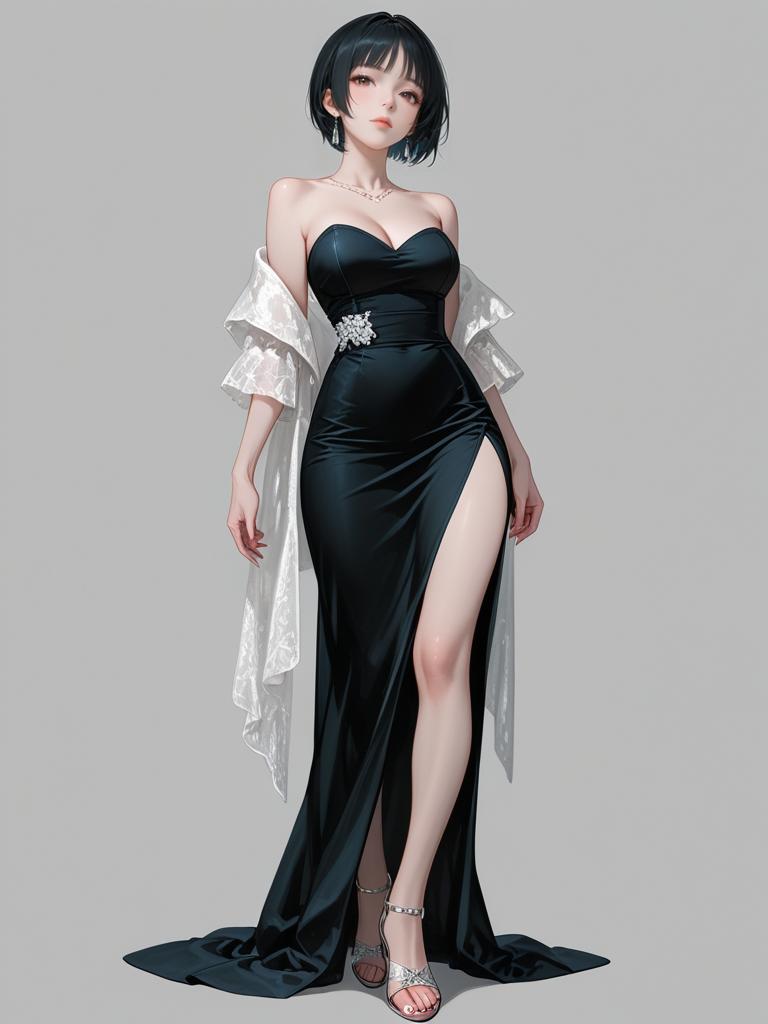 Digital anime-style drawing of a young woman with short black hair, wearing a white blouse, black high-waisted skirt, and black heels, holding