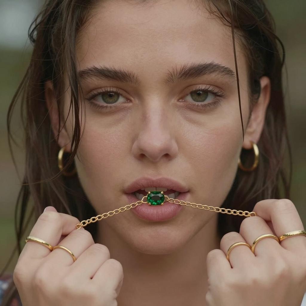 Close-up photograph of a woman with wet brown hair, light skin, and intense expression. She holds a gold chain with a green gem between her slightly parted lips. Both hands are visible, with gold rings on her fingers. Her right hand rests near her chin. Background is blurred and out of focus.