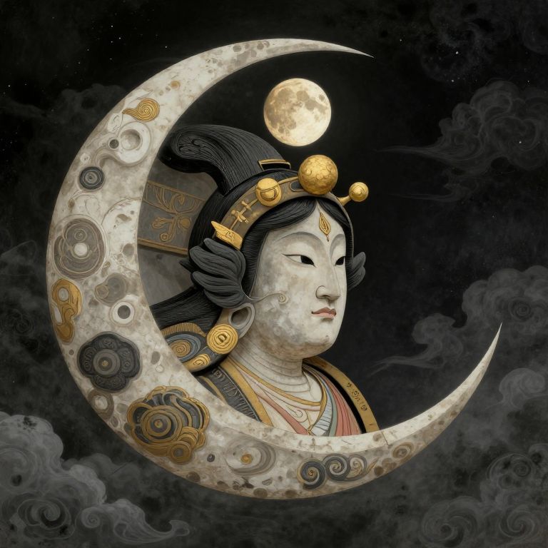 Digital art of an Asian goddess with pale skin, black hair, and gold headpiece, serene expression, surrounded by moon and clouds.