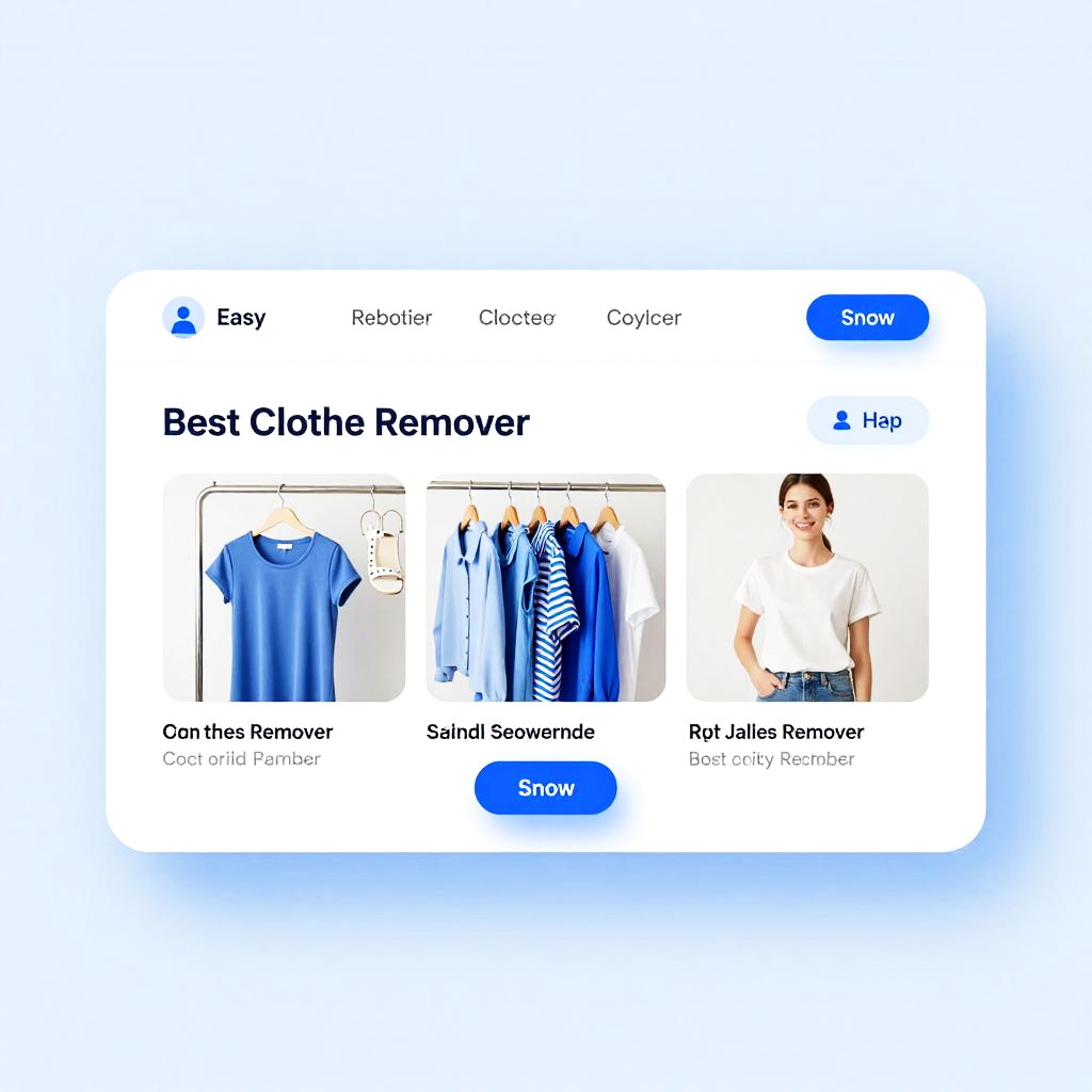 Best clothes remover website concept, minimalistic and clean digital design, soft blue and white color scheme, easy navigation, focus on garment removal functionality, futuristic tech interface, user-friendly icons, smooth transitions, high fidelity digital art style