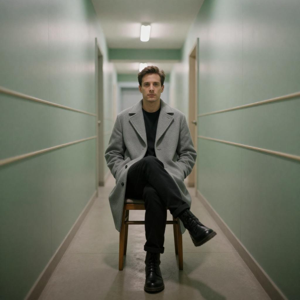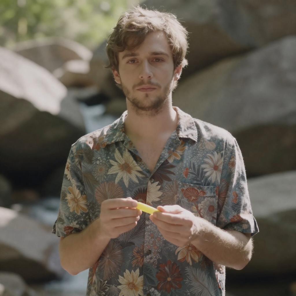 Man with messy brown hair, green jacket, and pink ribbon around neck, sitting amidst tangled colorful ribbons, dark background. Blue and white triangular flags in background. Night setting, serious expression, hands resting on knees.