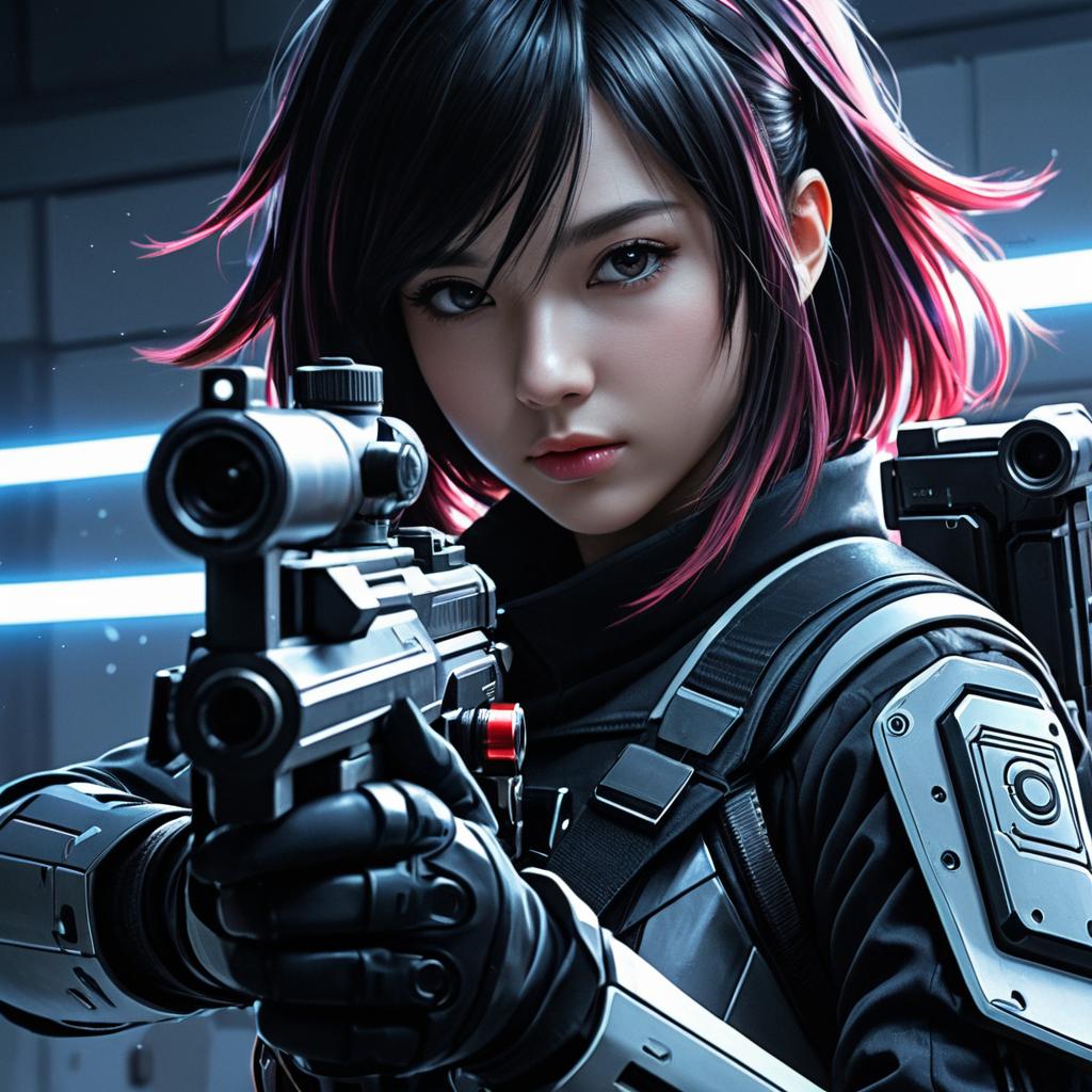 Digital painting of a striking anime-style sci-fi sharpshooter girl with half-body composition, featuring dynamic lighting and smooth gradients. The character has short black hair with vivid pink highlights, intense expressive eyes, and wears futuristic tactical armor with mechanical details. She is aiming a high-tech rifle, showcasing advanced weaponry in a sci-fi setting.