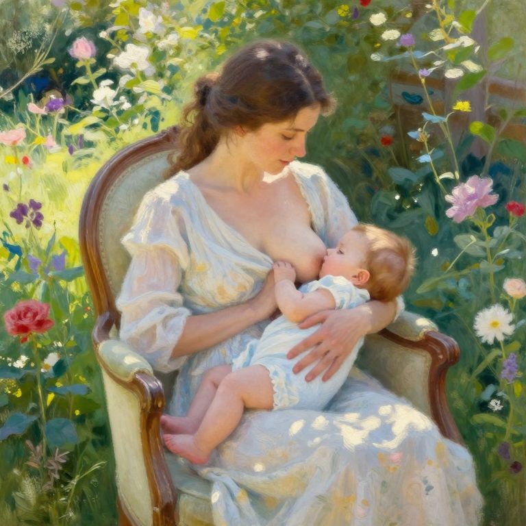 Impressionistic painting of a mother breastfeeding her baby while sitting on a vintage armchair in a sun-drenched garden. Surrounded by blooming flowers and lush greenery, the scene captures the natural beauty and tender care of motherhood with delicate brush strokes.