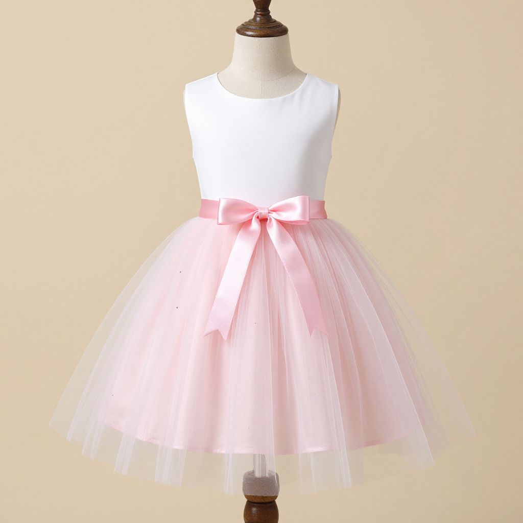 Photograph of a white sleeveless dress with a pink tulle skirt and pink ribbon bow, displayed on a dress form against a plain beige background.