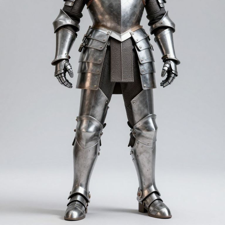 A person is wearing a metallic armor with a helmet and boots.