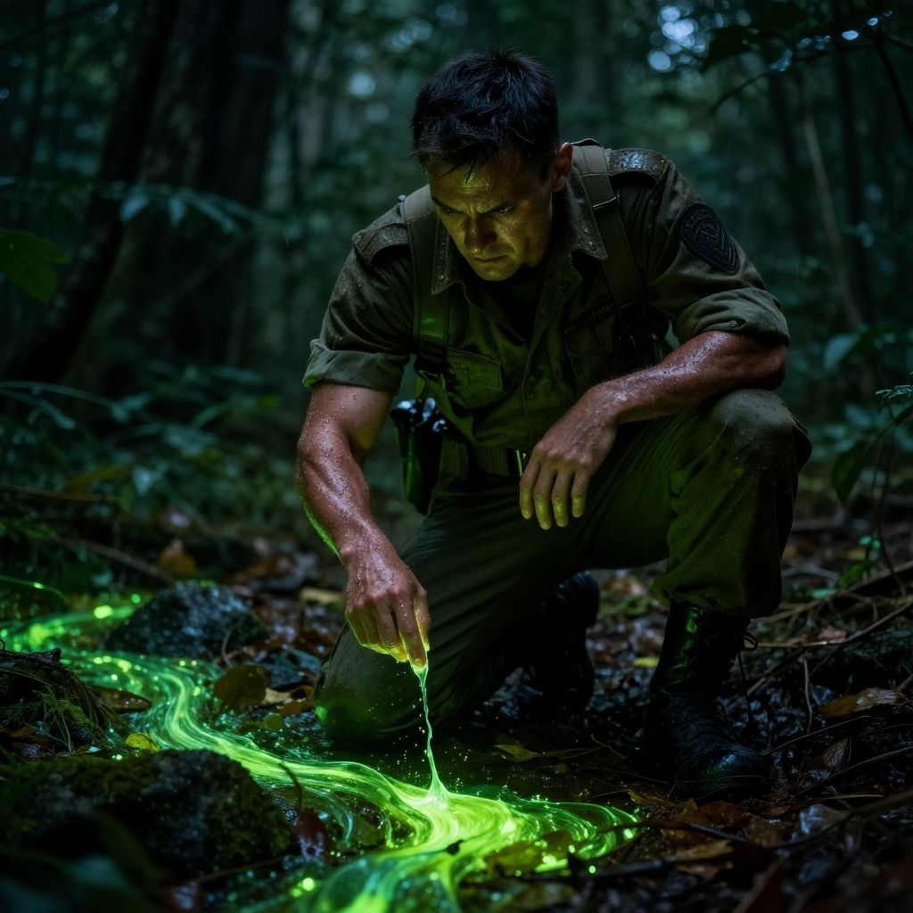 Neon-green splashes on the ground, Kneeling in dense foliage, the brutal weathered muscular soldier wearing military suite examines the neon-green, bioluminescent streaks of viscous liquid across fallen leaves and rocks. Running a finger through the translucent, pulsing fluid, he watches it cling to his skin before dripping back to the ground. Brow furrowed, eyes narrow with fascination and trepidation as he scans the darkened undergrowth, alert for signs of the extraordinary, unknowable predator. cinematic_still super_atmospheric incredibly_lifelike very_soft_shadows Brightly_Lit realistic high_exposure_raw_photograph canon_5d_camera analog_film Whimsical_and_Numb ([grayscale:vivid colors:0.76]:1.2), high_exposure (two arms and two legs in photorealistic cinematic still:1.3), hyper_realistic_detailed_skin, ((gloom:1.3) of morning light:1.1) (shallow dof swirly portrait_lens bokeh:0.8)