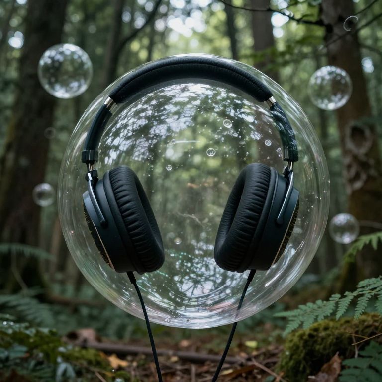 Photograph of black, cushioned headphones encased in a transparent bubble, floating in a forest with green ferns and bubbles.