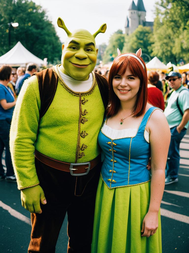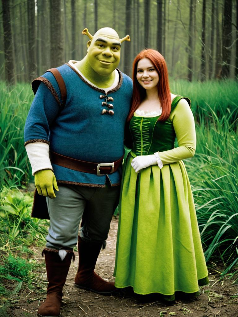 Couple in Shrek and Fiona Costume, full-body cosplay photo with swamp setting