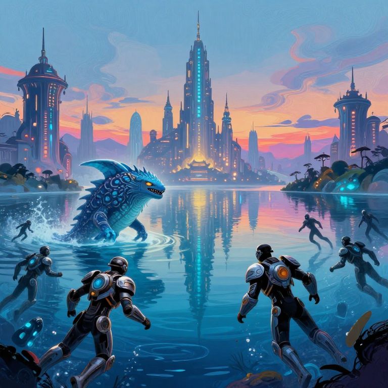 Digital illustration in a vibrant, sci-fi fantasy style. A massive, blue, dragon-like creature with intricate scales emerges from a reflective, blue-hued lake at sunset. Surrounding it are six armored, futuristic warriors in black and white, chasing it. The background features a futuristic cityscape with towering skyscrapers and a colorful, orange-pink sunset sky. The water ripples around the dragon, and the city lights reflect on its surface, adding a sense of dynamic movement. The scene is both action-packed and visually stunning, blending elements of fantasy and science fiction.