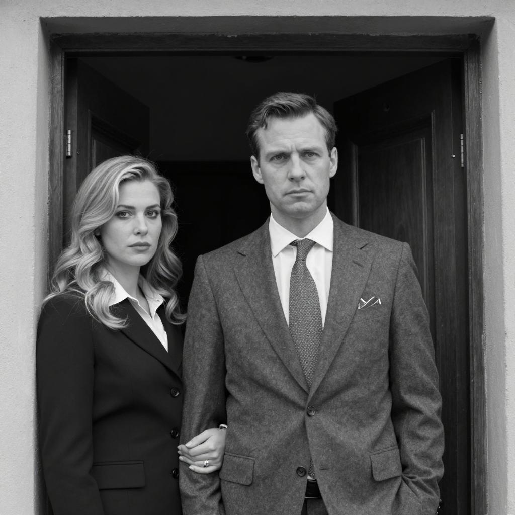 Black and white portrait of a serious-looking family consisting of a blonde woman with wavy hair wearing a white blouse, a man in a pinstripe suit and white shirt, and a young boy in a sweater with short dark hair. The man looks to the right while the woman looks at him, and the boy touches his head with a thoughtful expression. The background features curtains and a wall.