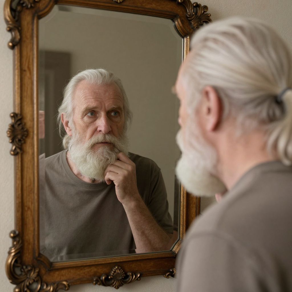 An elderly man with a long white beard and ponytail gazes into a vintage wooden-framed mirror, his contemplative expression mirrored by an alternate version of himself, creating a surreal and introspective moment captured in high-definition digital art.