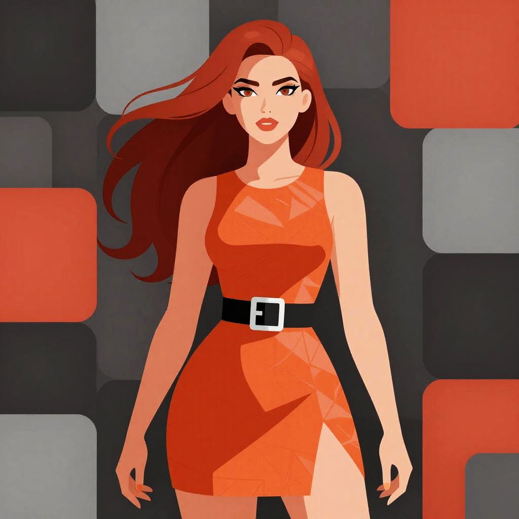 Digital illustration of a confident woman with long, flowing red hair, wearing a sleeveless, form-fitting orange dress with a black belt featuring a white square buckle. She has fair skin, bold red lips, and intense brown eyes. The background consists of a geometric pattern with large, alternating squares in black, gray, and red. The style is modern and vibrant, with sharp, clean lines and a pop art influence. The woman stands centrally, facing forward, with a slight tilt to her head, exuding a strong and stylish presence.