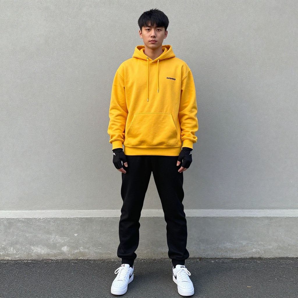 "sports costume guy, 1boy, male focus, solo, hood, pants, hoodie, shoes, sneakers, full body, standing, yellow hoodie, outdoors, gloves, black pants, black hair, realistic, looking at viewer, white footwear, aura, day, hood down, fingerless gloves, closed mouth Realistic photo of casual sexy person with pretty face"