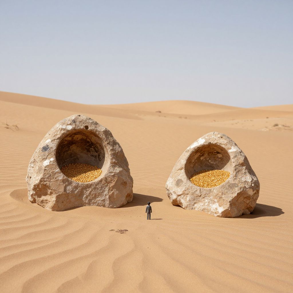 Silent desert sands cradle two weathered meteorite-like structures, each hollowed out and filled with small, golden seeds, while a tiny human figure stands dwarfed beneath them, emphasizing the vastness and mystery of the arid landscape.