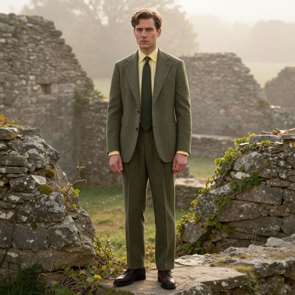 A man, olive green tweed suit, notch lapel jacket, pleated trousers, pale yellow dress shirt, dark green tie, dark brown derby shoes, ancient stone ruins, overgrown with ivy, misty morning light, contemplative expression, soft focus, warm tones. Man has masculine face and piercing eyes