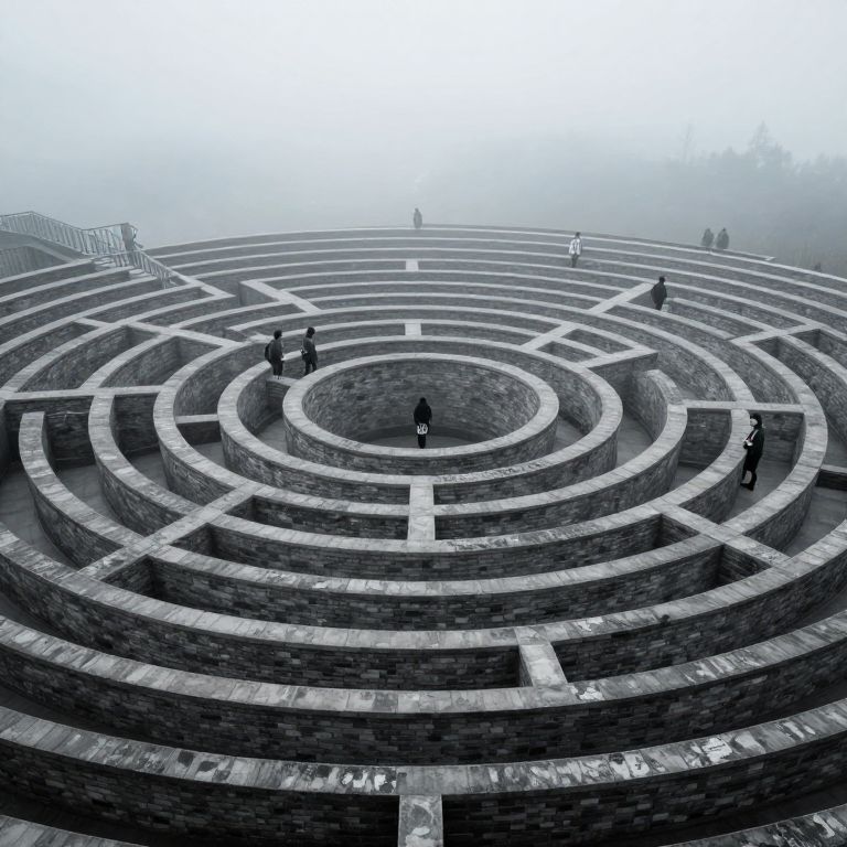 This is a high-contrast, digital photograph of a large, multi-tiered, stone maze with circular and rectangular pathways. The maze is constructed from gray bricks, with a slightly weathered texture. Five small, dark figures are scattered across the maze, appearing as silhouettes due to the bright, overexposed background. The top of the maze is bordered by a metal railing on the left, while the right side fades into a misty, white sky, creating a sense of depth and mystery. The overall color palette is monochromatic, dominated by shades of gray and white.