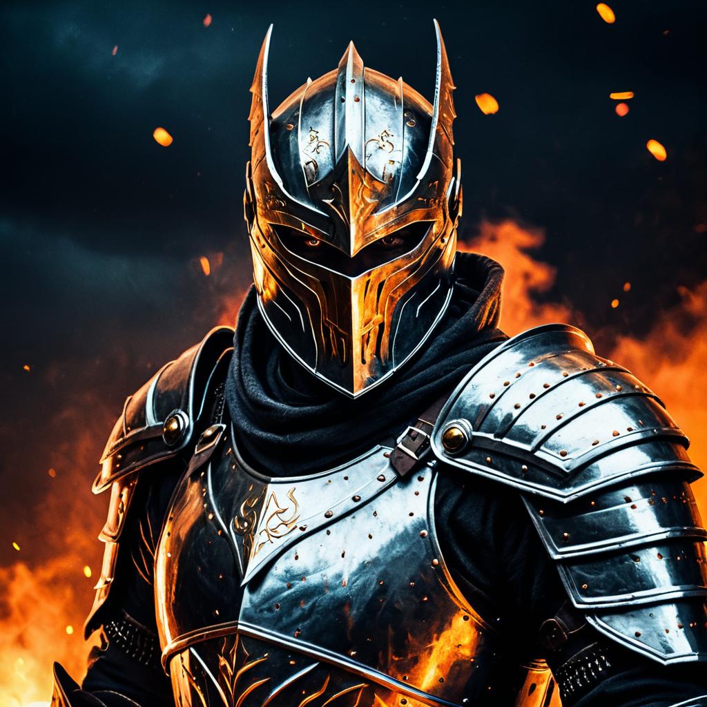 Gilded shadow assassin with helmet and mask, all-black armor, intimidating face mask and helmet, plain black background, dark black theme, Mamiya lens photography, dramatic, complex details, professional photography, 8k, photo-realistic, octane rendering, global illumination, RTX ray tracing, VFX post-processing