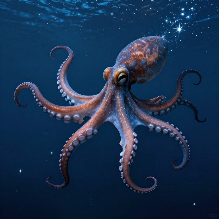 Photograph of a vibrant, detailed octopus underwater. The octopus has a bulbous head with orange and white mottled patterns, large expressive eyes, and eight long, curling tentacles adorned with white suction cups. The background is a deep blue ocean with twinkling star-like sparkles, creating a magical, ethereal atmosphere. The image emphasizes the texture and flexibility of the tentacles against the smooth, dark blue water, highlighting the octopus's graceful yet dynamic movement.