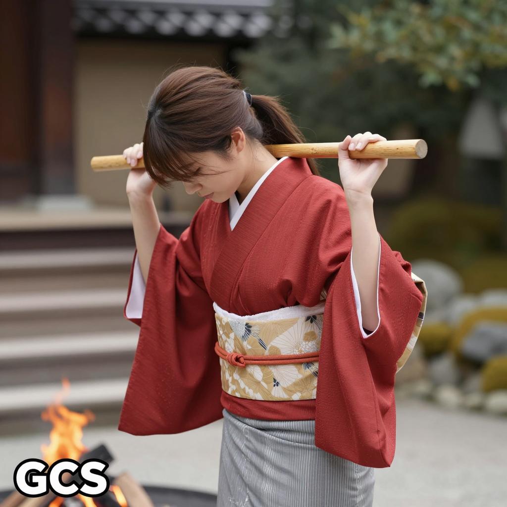 Woman with long brown hair in red kimono and gray hakama, bowing with hands raised, holding a wooden stick over her shoulder. Background: blurry greenery and wooden steps with fire in the lower left. GCS Japan in bottom left.