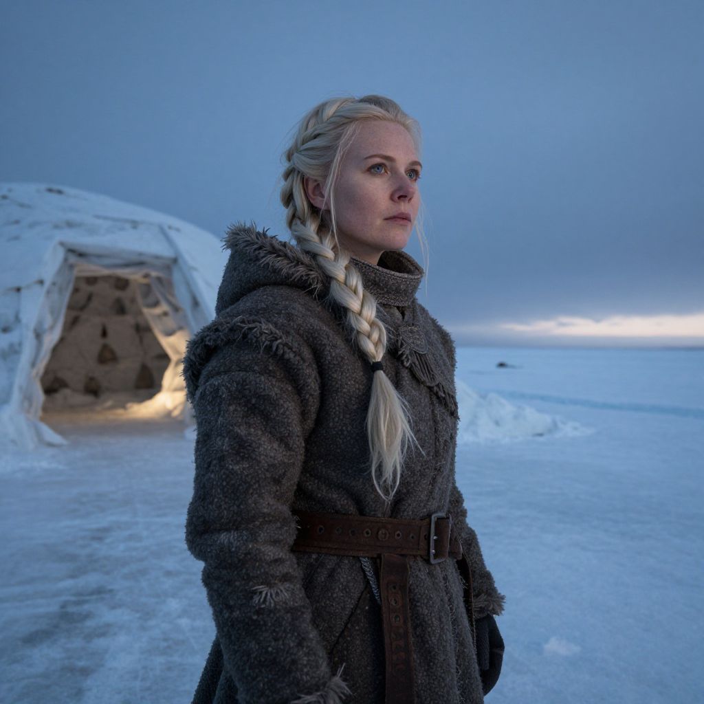 Photograph of a blonde woman with a braid, wearing a thick, dark grey, fur-trimmed coat with a brown belt, standing in a snowy landscape under a blue, overcast sky. She has fair skin and a serious expression. In the background, to the left, is a snow-covered igloo with a warm, yellow light glowing from its entrance. The snow-covered ground extends to a horizon where the sky meets the sea. The overall color palette is cool with blues and whites dominating, creating a cold, wintry atmosphere. The woman is positioned slightly to the right, facing forward.