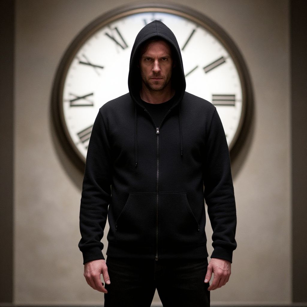 "Warlock Man, a man in a hoodedie standing in front of a clock"