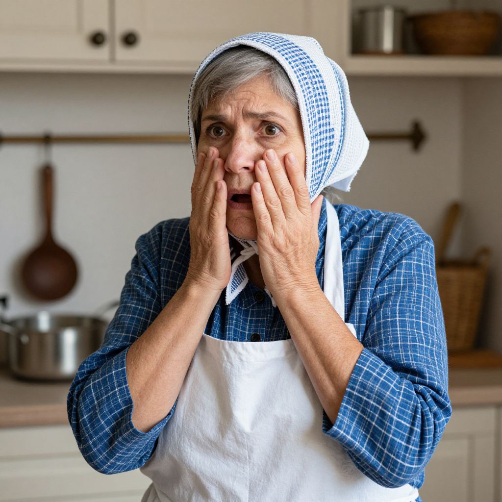 An elderly woman in a traditional kitchen setting, wearing a blue and white bonnet and apron, appears to be in a state of concern or surprise.