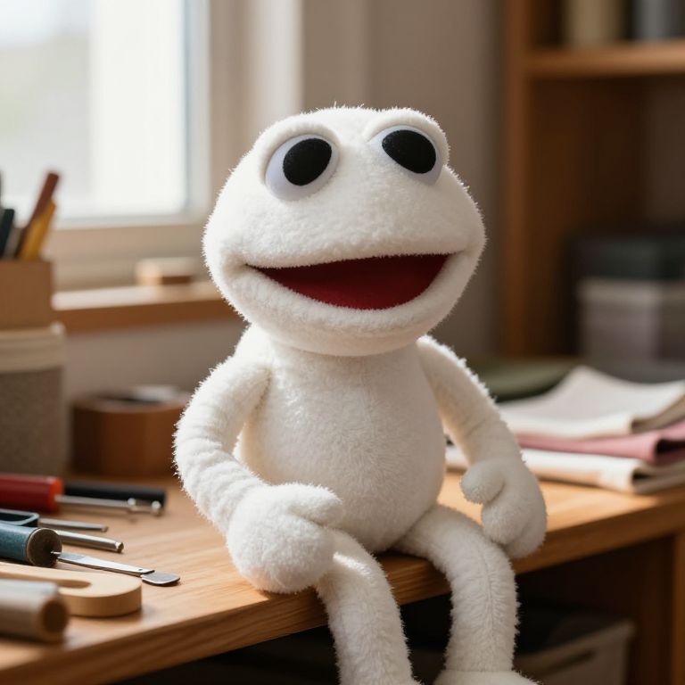 Cheerful White Muppet in Workshop