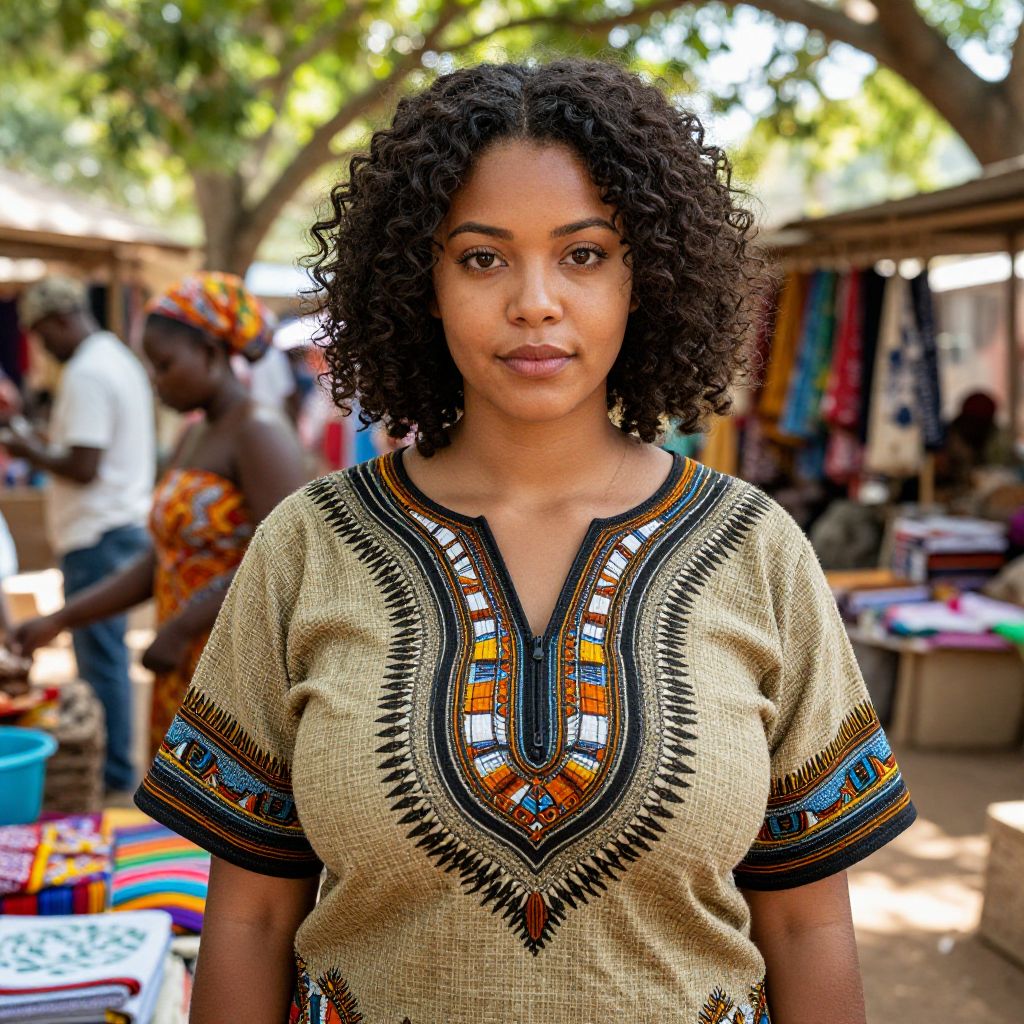 A realistic photograph of a diverse woman in her late 20s with warm brown eyes and natural curly hair wearing a fair trade clothing costume, consisting of a handwoven, earth-toned dashiki with embroidered patterns, standing in a vibrant market in a developing country, surrounded by local artisans and handmade textiles, sunlight filtering through the canopy of trees.. The woman has big tits and cute face