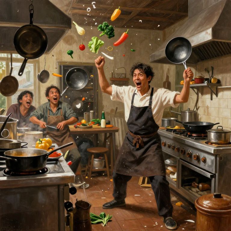 A chaotic balagan kitchen interior, countless pots and pans clanging, vegetables flying, a chef juggling cooking tasks, exaggerated expressive faces, messy yet inviting space, warm rustic colors, sense of frantic motion captured in painterly style