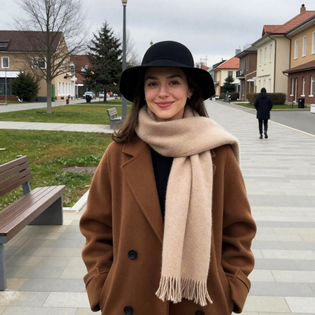 Young woman with fair skin, brown hair, black hat, brown coat, beige scarf, smiling, standing on a paved walkway. Background includes grassy area, trees, benches, buildings, and another person in dark clothing in the distance. Overcast sky.