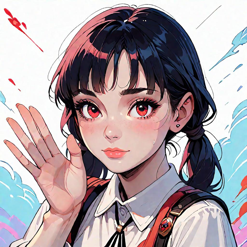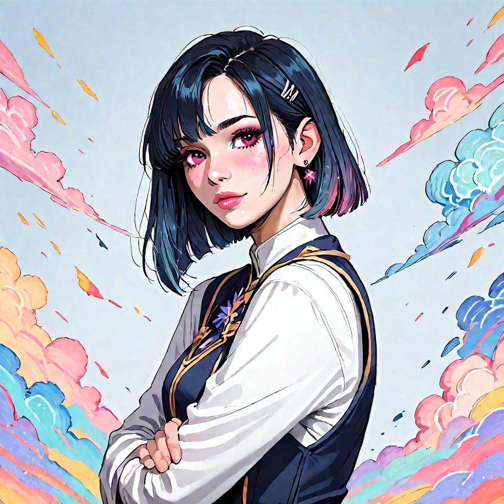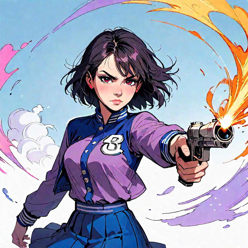 Score_9, score_8, score_7, source_anime, rating_general, yellow eyes, letterman jacket, purple shirt, white sleeves, skirt, blue skirt, 1girl, solo, kneeling, aiming, firing, handgun, bowling alley