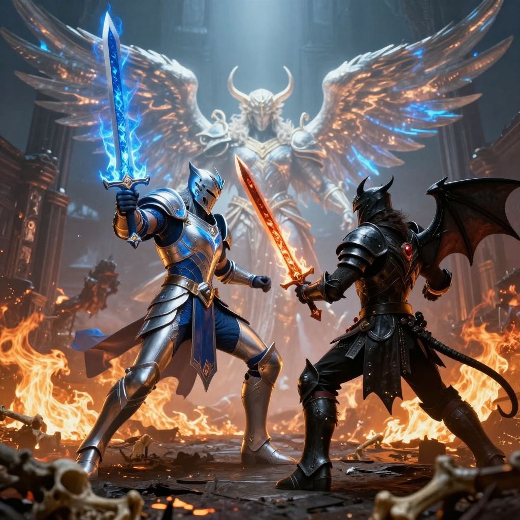 Hellish landscape with bones and flames 2 figures battle, full body angelic warrior attacking pose shining armor and closed helmet with silver and sapphire accents holding a sword of blue flame, 3/4 body demonic warrior defending pose black armor and closed helmet black flamed sword with ruby accents, hellgate london angelic sanguinius huge archangel glowing energy wings, UHD 8k ultrarealistic details