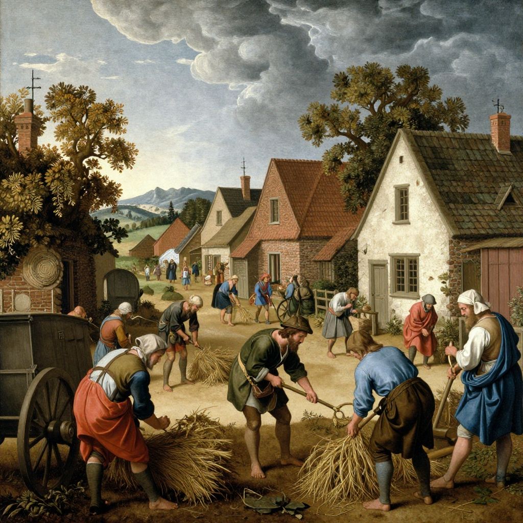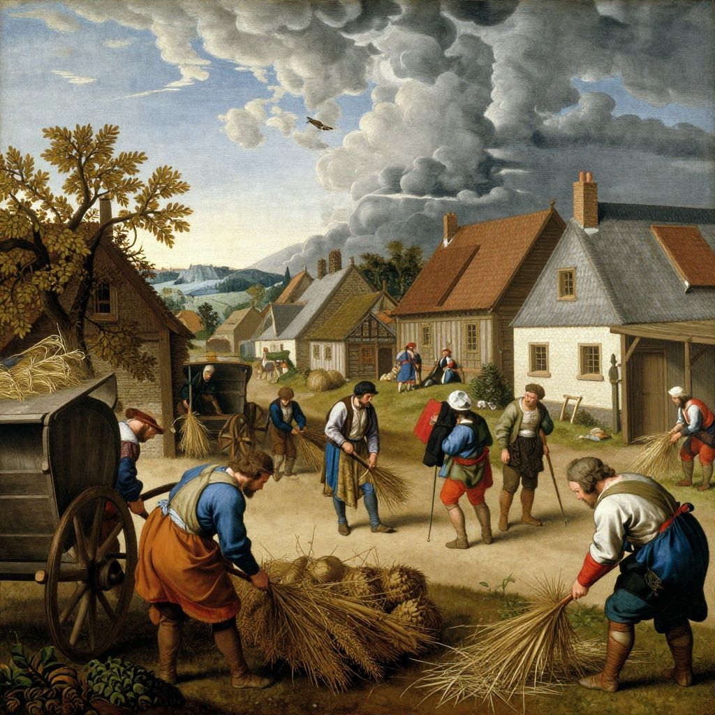 Photograph-style painting of 17th-century rural village scene with villagers carrying bundles of straw, dark cloudy sky, wooden houses, and carts.