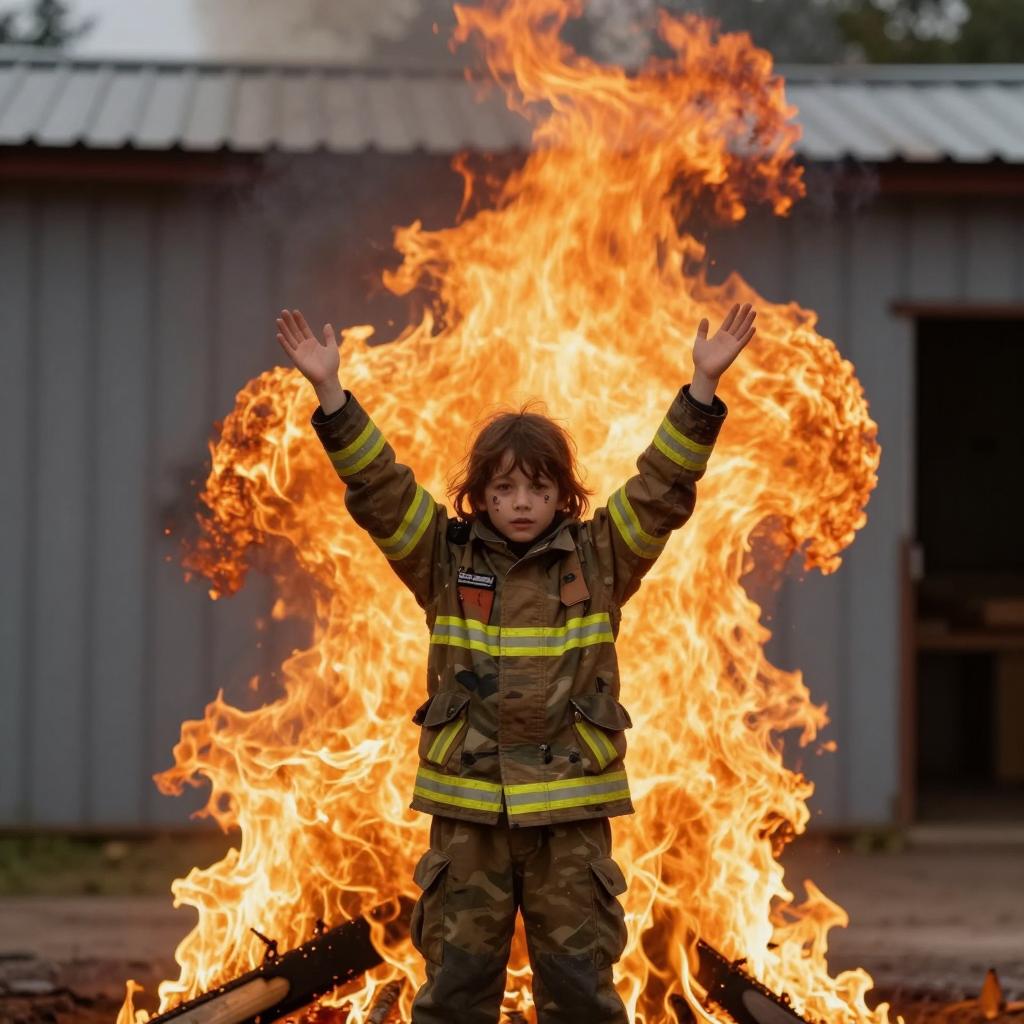 Young child wearing camouflage firefighter jacket and pants standing with arms raised in front of intense bright orange flames, metal shed in background during daytime. The fire is consuming the area behind the child, creating a dramatic scene.