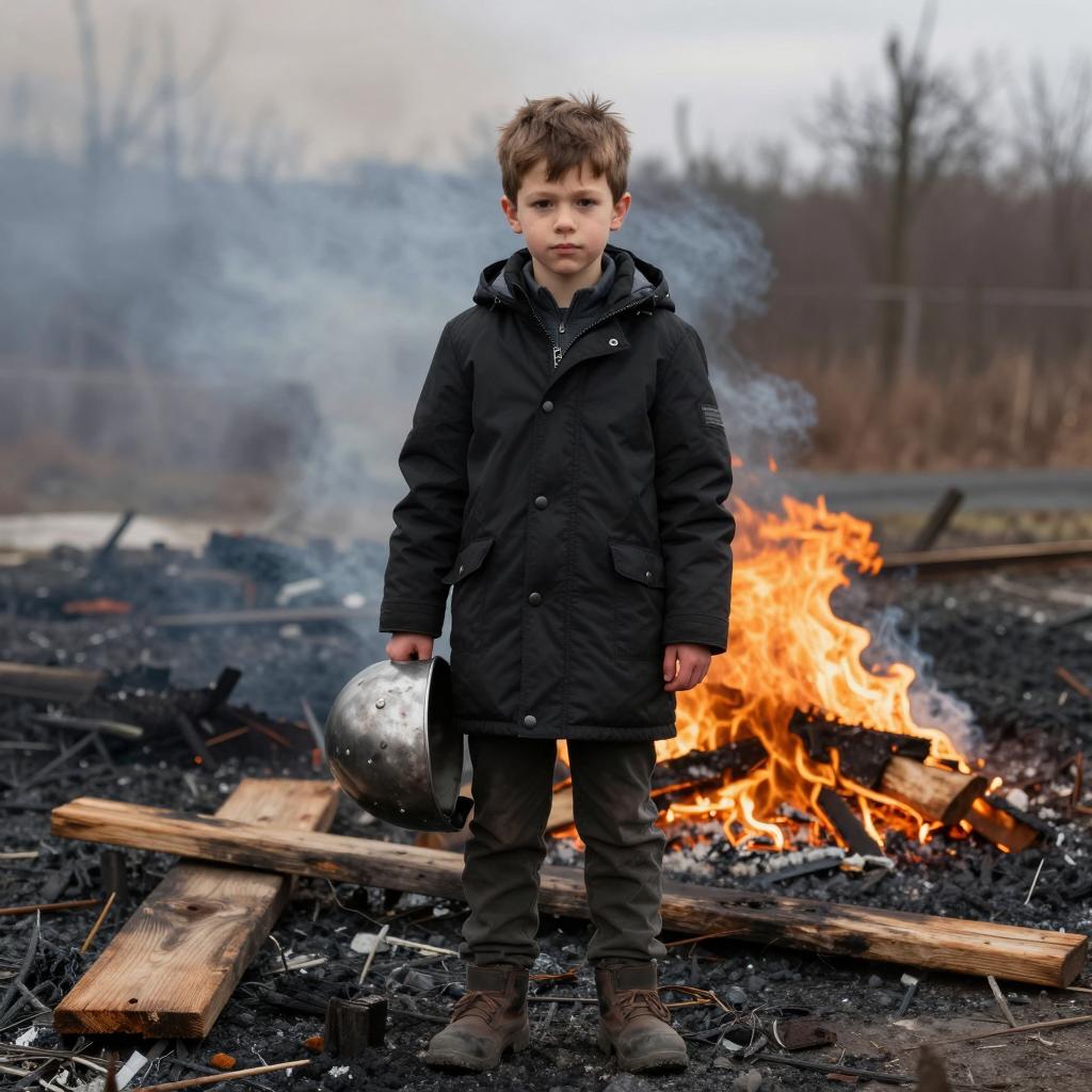 Child engulfed in bright orange flames, standing with arms raised, wearing camouflage clothes, in front of large fire, metal shed in background, daytime, intense fire consuming surroundings.