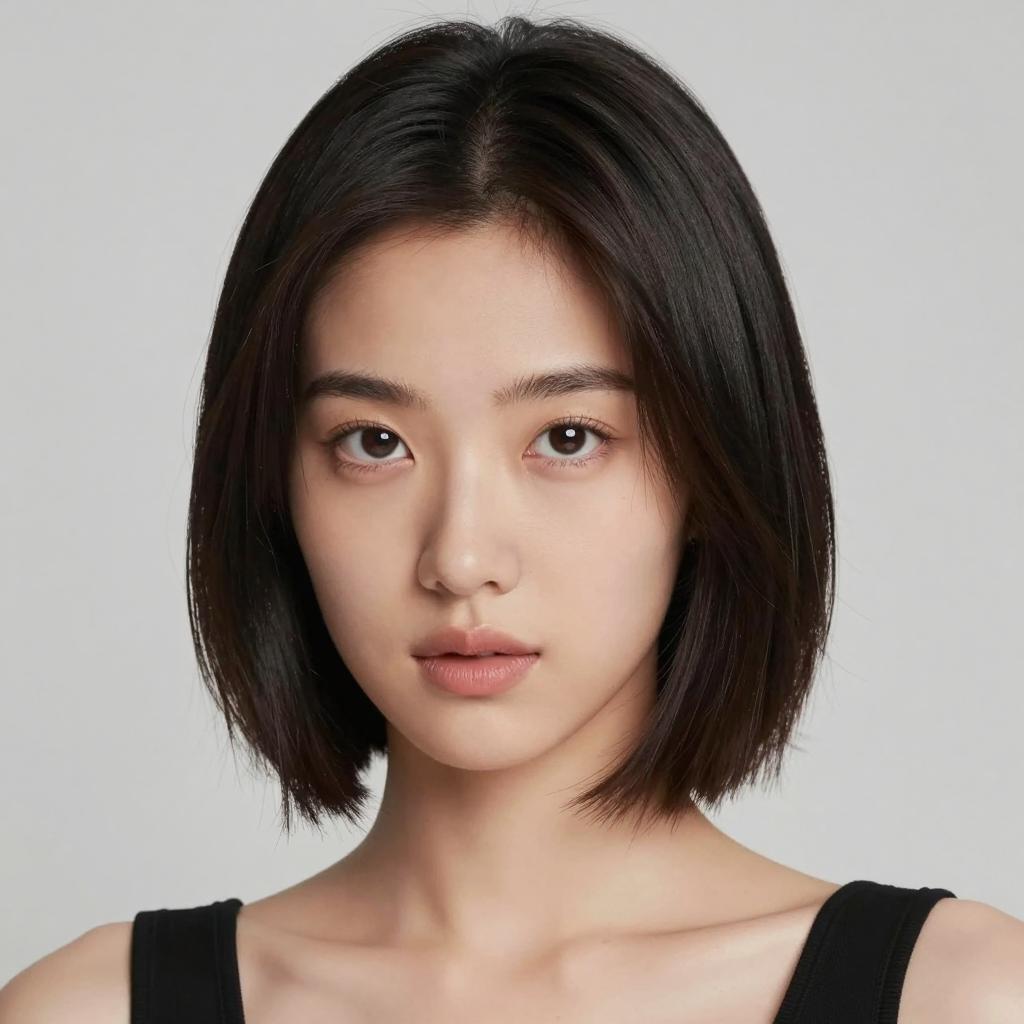 This striking portrait captures a woman with a sleek bob hairstyle and a captivating expression, embodying modern beauty aesthetics. The soft lighting and minimalist background enhance her features, creating a sense of elegance and sophistication.