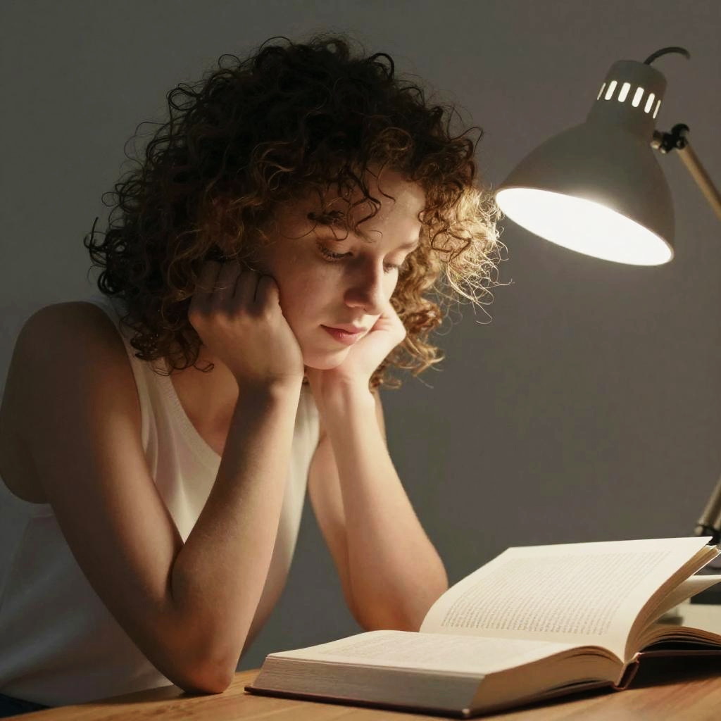 Worried Woman Under Desk Lamp
