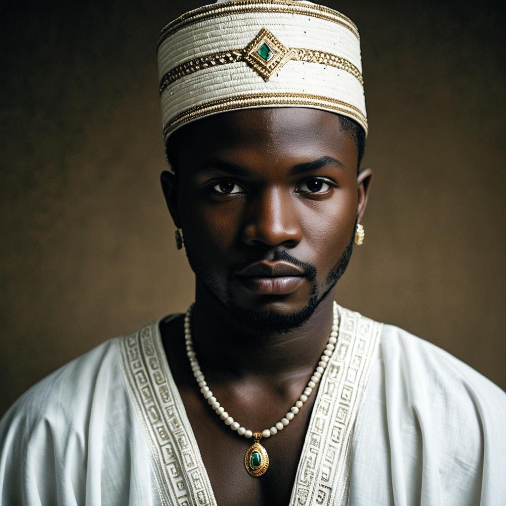 Portrait of a young Nigerian man wearing traditional white embroidered robe and a matching hat adorned with gold and green details. He is accessorized with a pearl necklace featuring a gold and green pendant and matching earrings, looking directly at the camera with a neutral expression against a brown background.
