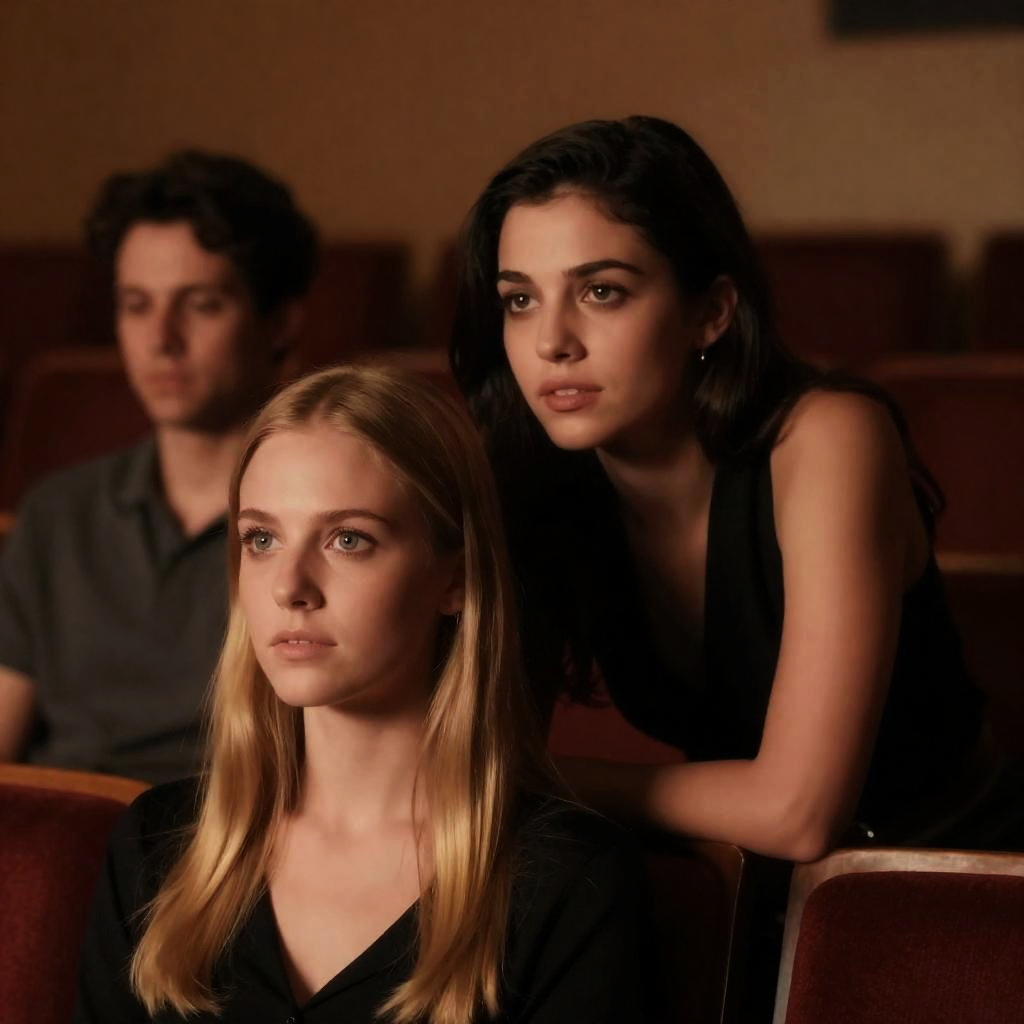 Photograph of three people in a dimly lit theater. Blonde woman with light skin and straight hair in front, looking ahead with a neutral expression. Dark-haired woman with light skin, wearing a sleeveless black top, leaning close from behind, gazing at blonde woman. Man with short dark hair and light skin, blurred in the background, looking downward. Warm orange lighting casts shadows.