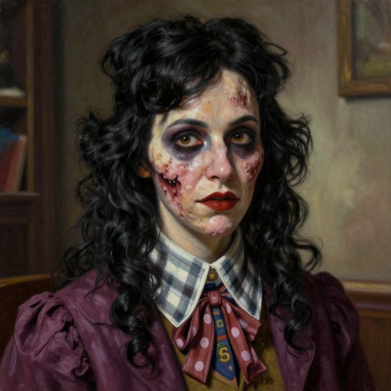 Photorealistic digital painting of a pale-skinned woman with dark, curly hair, wearing heavy makeup with black around her eyes and smeared red on her cheeks and nose. Her expression is solemn. She wears a purple jacket over a plaid shirt with a red polka dot bow tie, and a yellow and blue striped vest. The background is dimly lit, with a wooden bookshelf to the left and a framed picture on the right. The overall style is gothic and slightly eerie, with detailed textures and realistic lighting.