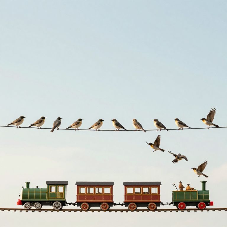 A whimsical procession of birds perched on a wire, seamlessly transitioning into a miniature train, symbolizes the delicate balance between freedom and purpose, evoking a sense of wonder and the timeless dance between individuality and collective movement.