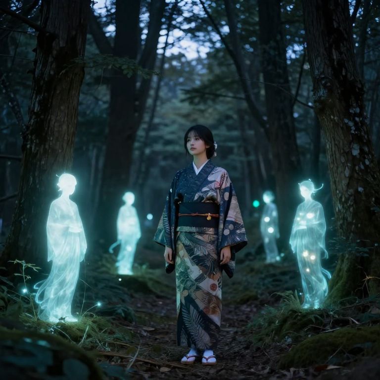 Oshino standing in a mystical forest at twilight, surrounded by glowing spirits and ancient trees, wearing traditional Japanese clothing with intricate patterns, soft magical light illuminating the scene, atmospheric and serene.
