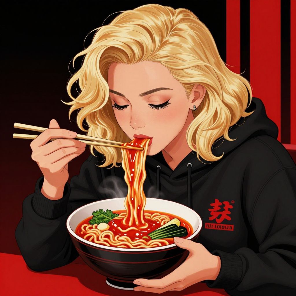 In this striking illustration, a woman with voluminous, wavy blonde hair is depicted in a dynamic pose, her head tilted slightly downward as she savors a bowl of ramen. She holds a pair of chopsticks delicately in her right hand, poised to take a bite from the noodles that are generously coated in a vibrant red sauce. The bowl of ramen, brimming with noodles and garnished with a few vegetables, sits prominently in front of her, its contents almost overflowing with the rich, glossy sauce. The woman's black hoodie, adorned with a red logo and text, contrasts sharply against the dark background, drawing attention to the vivid colors of the ramen and her hair. The background features bold red vertical stripes, adding a sense of depth and dynamism to the composition. The overall scene is a harmonious blend of textures, from the smooth noodles and glossy sauce to the rough fabric of the hoodie and the soft, wavy hair, creating a visually engaging and appetizing depiction of a moment of culinary enjoyment.