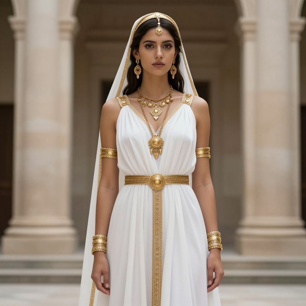 Ancient world costume, a woman in a white dress and gold jewelry standing in front of a building