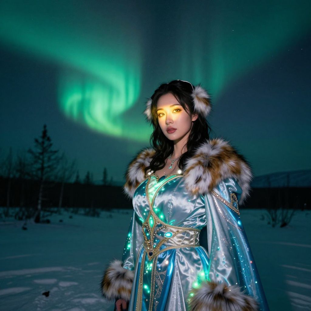 A stunning woman in a vibrant woman aurora costume standing in a snowy northern landscape at night, glowing with bioluminescent lights that mimic the aurora borealis, her face illuminated by soft northern lights with warm, glowing eyes and a serene expression, wearing detailed fur trim and flowing silver-blue fabric, realistic photography style, cinematic lighting. The woman has big breasts and cute face
