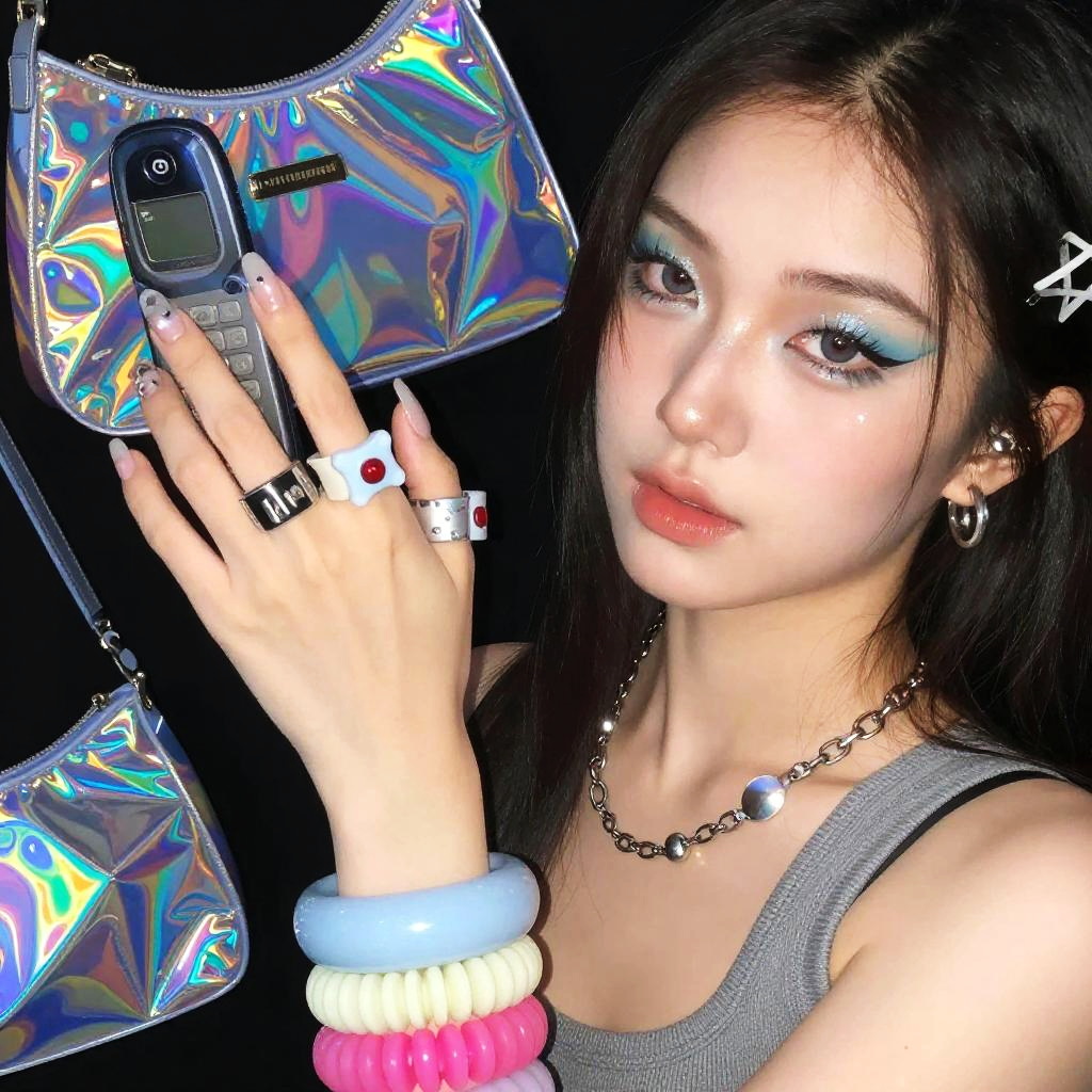 Asian Y2K inspired scene, close-up of accessories like chunky rings, plastic bangles, flip phones, holographic bags, combined with glossy makeup, pop culture elements, high contrast lighting