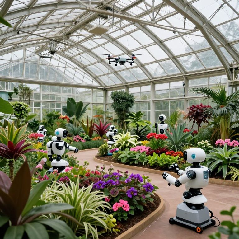 Photograph of a glass-domed greenhouse filled with vibrant, multicolored flowers and lush greenery. Six small, white, robotic drones with black accents and cameras are scattered throughout the garden, some on a curved, reddish-brown path. The drones have a spherical body and wheeled base. Overhead, a drone camera is mounted on a black track. The greenhouse's glass ceiling allows natural light to flood the space, highlighting the vivid plants and flowers. The background includes tall, leafy plants and a variety of colorful blooms, creating a lively, futuristic botanical scene.