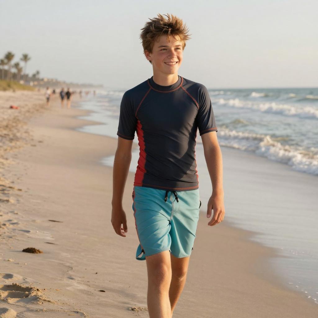 A teenage boy with spiky brown hair and mischievous grin walking down a sunny beach, wearing a sporty rash guard and board shorts, captured in golden hour lighting with photorealism.