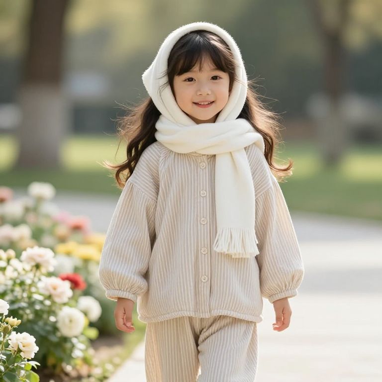 A young girl with long brown hair, soft and flowing, is wearing a cozy beige and white striped outfit that features a slightly oversized blouse and matching trousers. She has a white scarf wrapped neatly around her head, adding a gentle, warm touch to her look. The scene is bright and sunny, with a peaceful outdoor setting—perhaps a park or a garden—where she stands near a blooming flower bed, smiling warmly at the viewer. Her expression is joyful and innocent, and the light casts a soft glow on her face and the surrounding environment, creating a serene and heartfelt atmosphere.