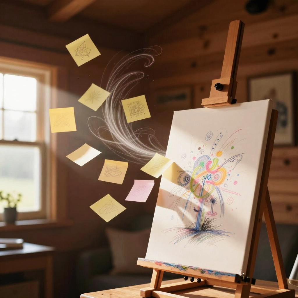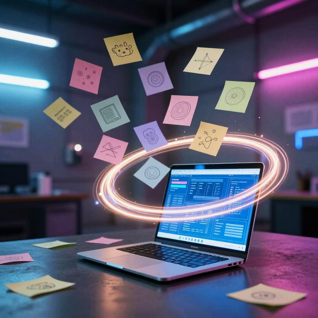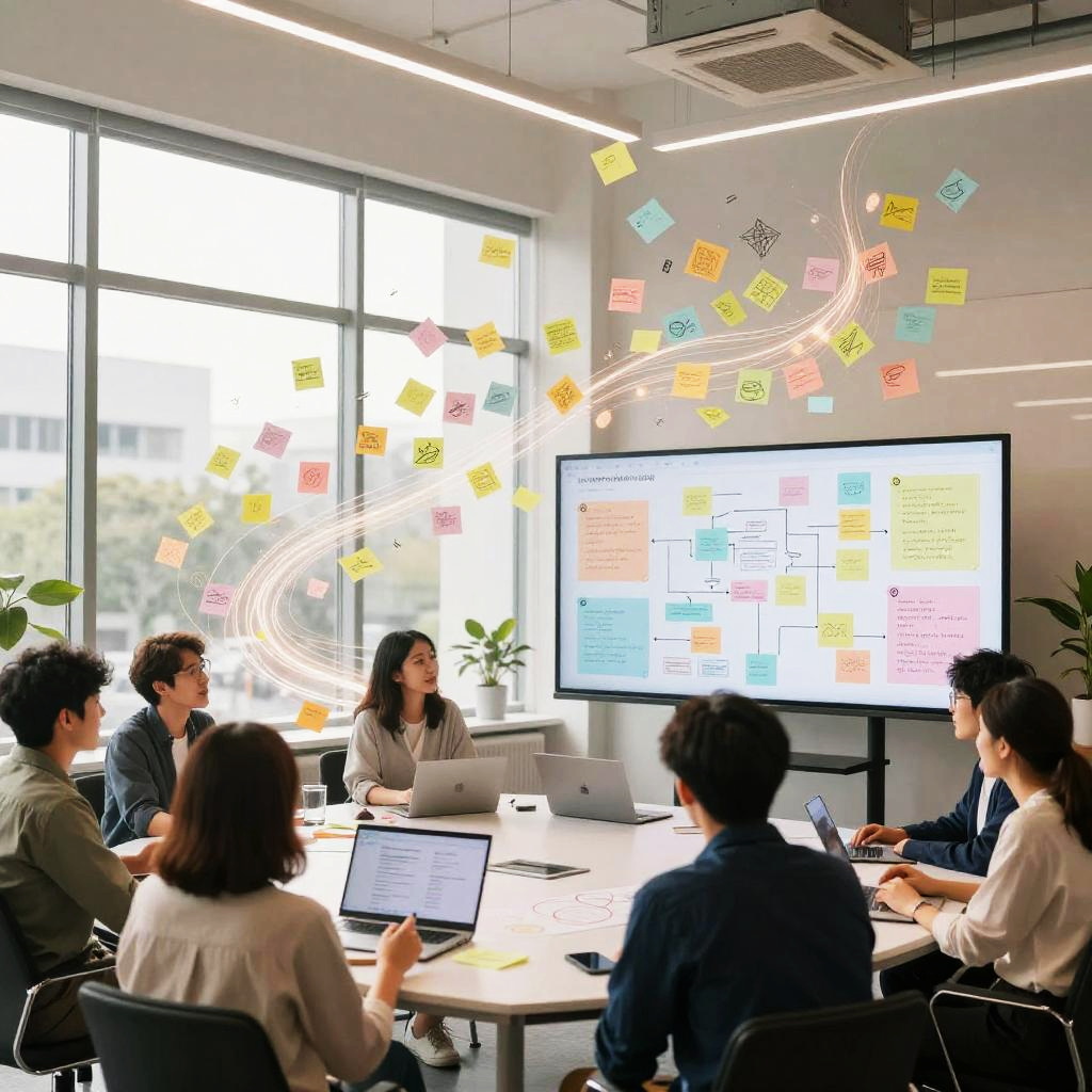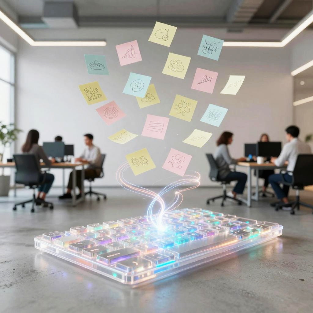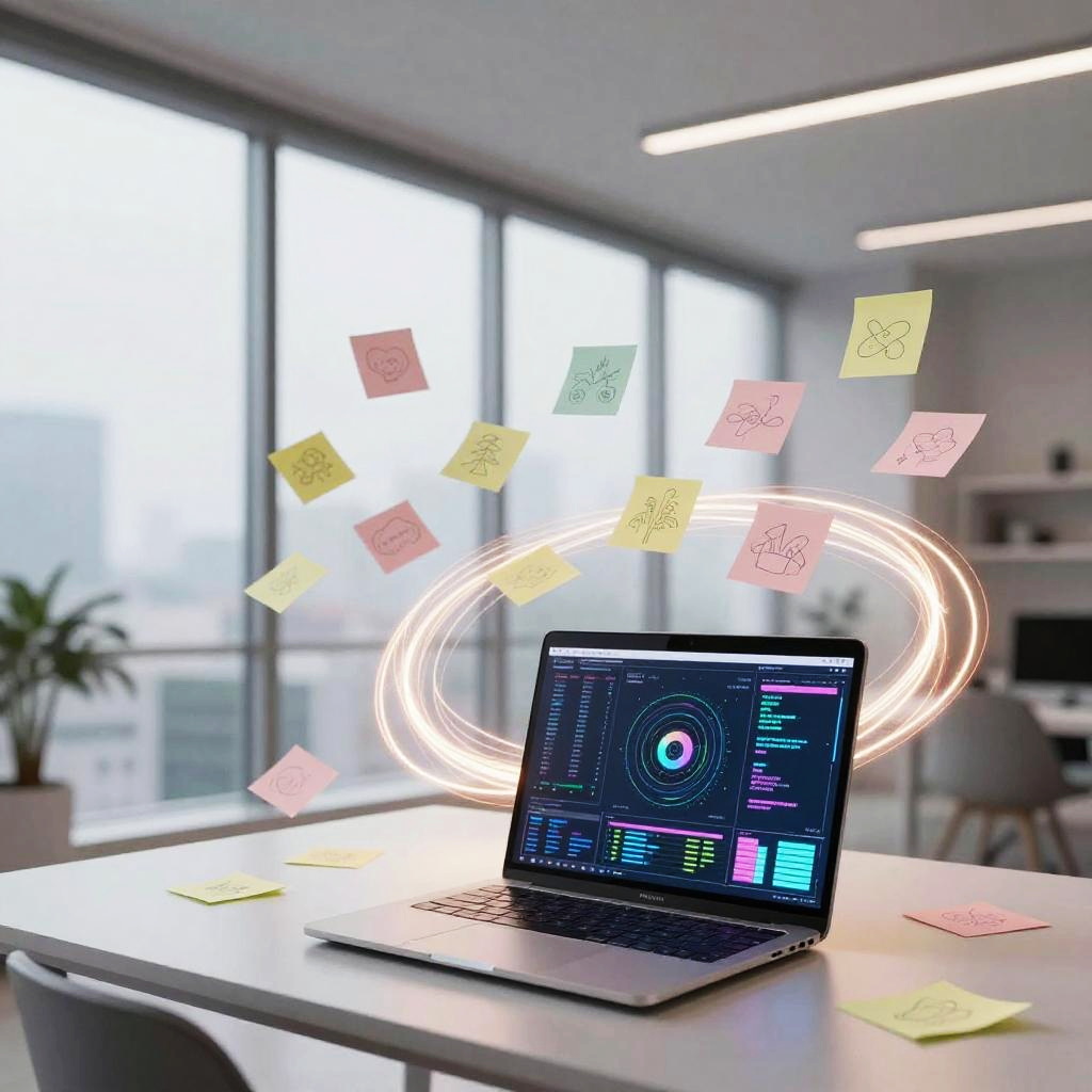 Weekly team ideation circle unfolds in bright open-plan office with floor-to-ceiling windows, floating pastel sticky notes and abstract doodles drift and cluster, swirling light trails weave around curved multi-screen setup displaying flowcharts; vibrant yet clean, cinematic composition, volumetric glow, tactile surfaces, crisp textures, ultra detailed, soft haze, optimistic, inspiring creativity
